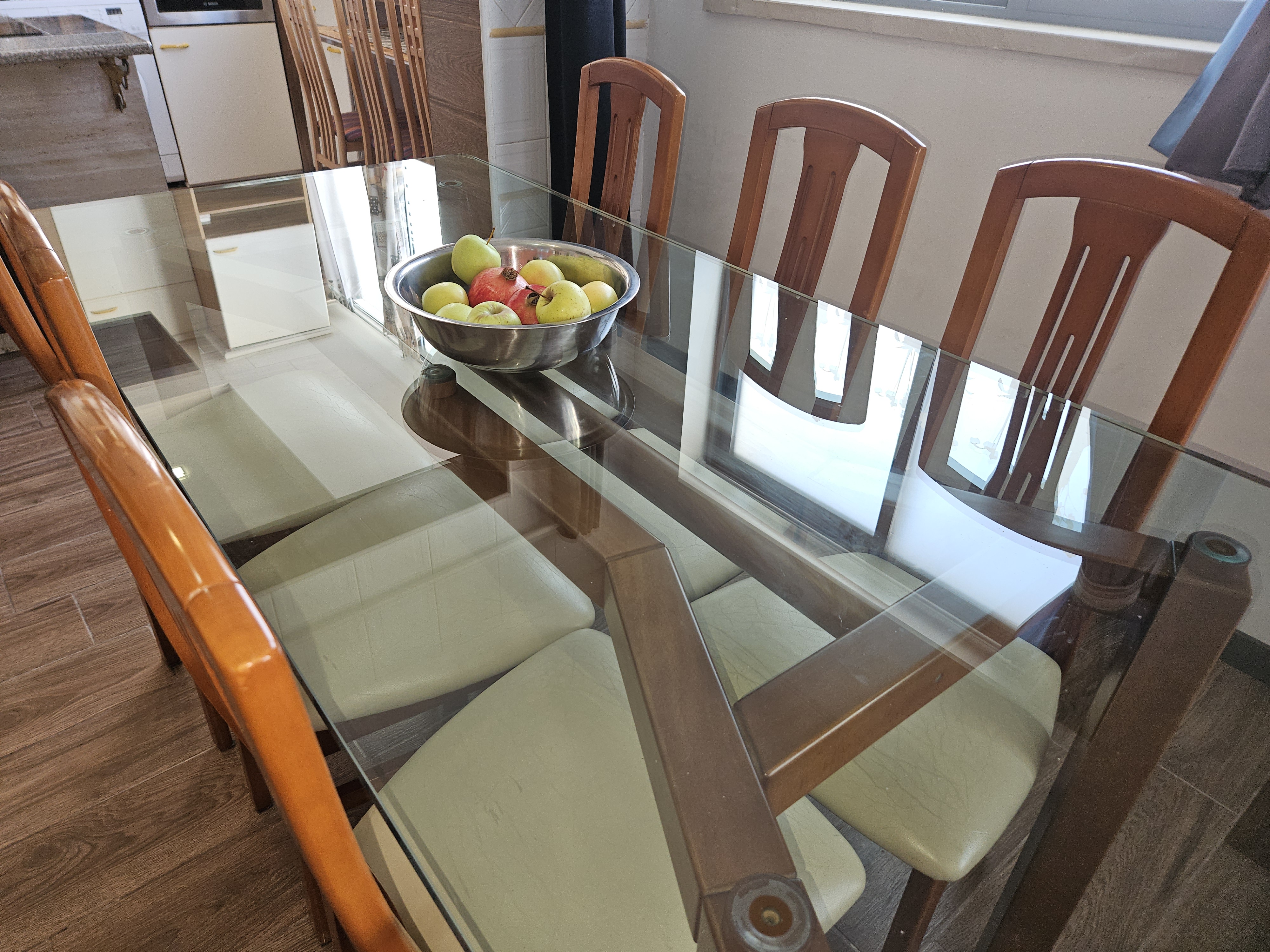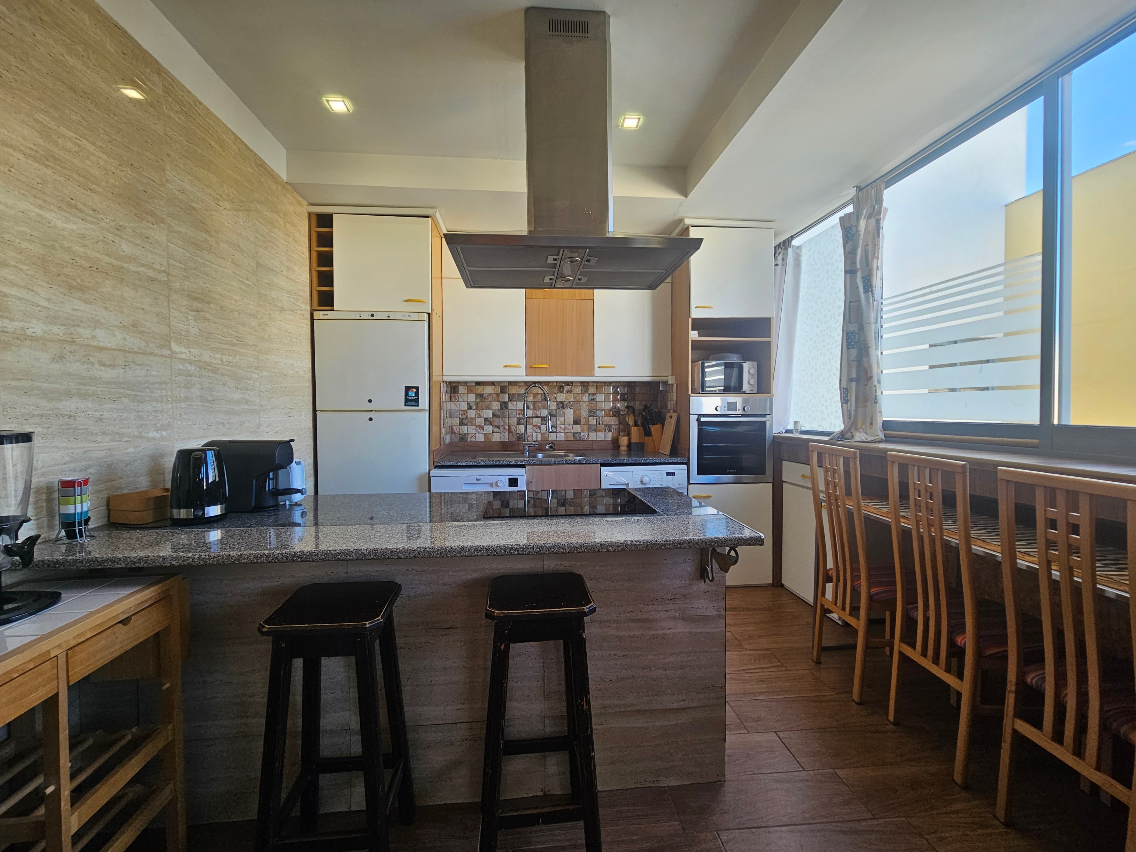Uma cozinha toda equipada, com mesa de refeições.