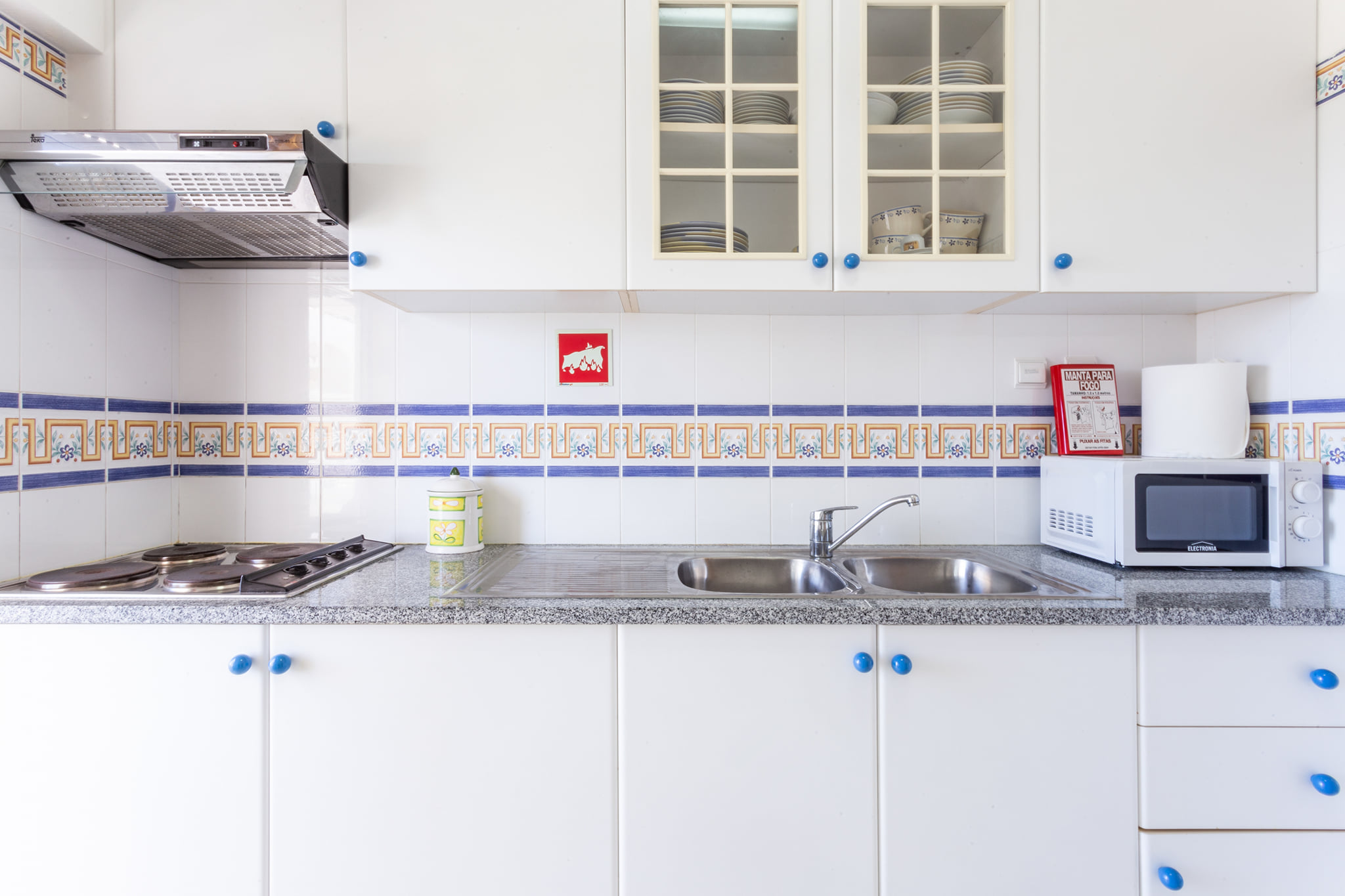 Eletrodomésticos ao dispor, máquina de café, torradeira, frigorifico, máquina de lavar roupa.